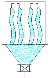 含塵氣體由進(jìn)氣口進(jìn)入灰斗或儲(chǔ)灰箱,通過(guò)花板孔或直接通過(guò)花板孔三種方式進(jìn)入濾袋。如圖2a、b、c所示,含塵氣體透過(guò)濾袋變?yōu)閮魵猓M(jìn)入箱體,再經(jīng)箱體上部排氣口,由風(fēng)機(jī)排走。粉塵積附在濾袋的內(nèi)表面,且不斷增加,使袋收塵器的阻力不斷上升。當(dāng)阻力上升到1500—2000Pa時(shí)為了使袋收塵器繼續(xù)工作,需定期清除濾袋上的粉塵。具體清灰時(shí),首先關(guān)閉頂上風(fēng)機(jī),搖動(dòng)電機(jī)上偏心作用,帶動(dòng)連桿,使搖動(dòng)軸左右來(lái)回轉(zhuǎn)動(dòng),濾袋就呈波紋狀態(tài),使粉塵掉下,卸出。清灰狀態(tài)如圖3所示。