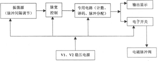 本控制儀由雙時基電路CH7556的1/2作為無穩(wěn)態(tài)多諧振蕩器產(chǎn)生周期為1~99秒的可調(diào)脈沖信號;另1/2作為單穩(wěn)態(tài)電路完成計數(shù)、譯碼、脈沖分配等一系列邏輯功能,再由專用電路的各輸出端輸出所設(shè)定的脈沖寬度信號至電子開關(guān)(VMOS電路),控制電磁脈沖閥的開啟,噴吹壓縮空氣,同時由數(shù)碼管顯示噴吹順序。