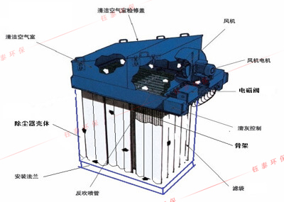含塵空氣由風口進入除塵器箱體內(nèi),細小塵粒由于濾袋的多種效應作用,被滯阻在濾袋外壁。凈化后的氣體通過濾袋從上箱體出風口排出。隨著使用時間的增長,濾袋表面吸附的粉塵增多,濾袋的透氣性減弱,使除塵器阻力不斷增大。為保證除塵器的阻力控制在限定的范圍之內(nèi),由脈沖控制儀發(fā)出信號,循序打開電磁脈沖閥,使氣包內(nèi)的壓縮空氣由噴吹管各噴射到對應的骨架(稱為一次風),并在高速氣流通過骨架時誘導數(shù)倍于一次風的周圍空氣(稱為二次風)進入濾袋,造成濾袋瞬間急劇膨脹,由于反向脈沖氣流的沖擊作用很快消失,濾袋又急劇收縮,這樣使積附在濾袋外壁上的粉塵被清除。由于清灰是依次分別向幾組濾袋進行,并不切斷需要處理的含塵空氣,所以在清灰過程中,除塵器的處理能力保持不變。