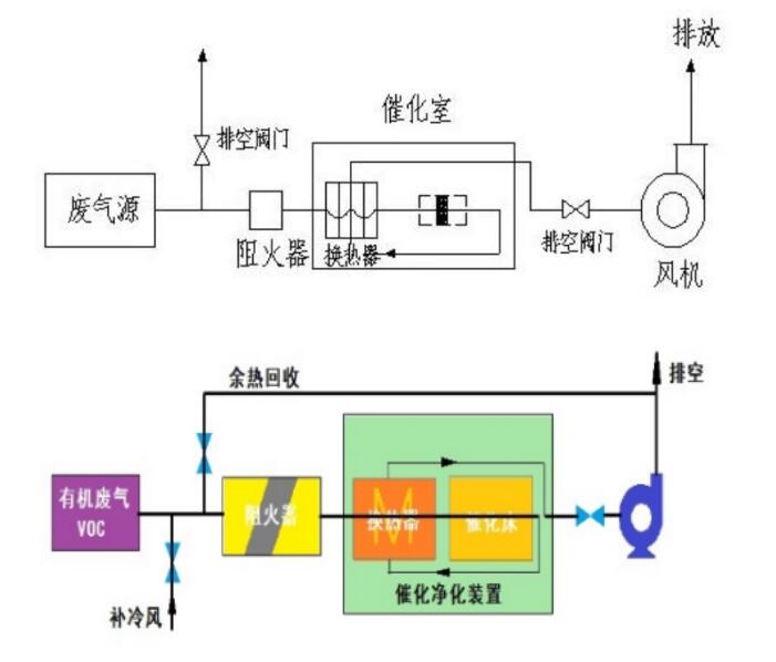 1.工藝原理 催化氧化技術(shù)(Catalytic Oxidizer,簡稱CO),通常是指將廢氣加熱到280℃以上,在催化劑的作用下將廢氣分解成CO2和和H2O,催化產(chǎn)生的高溫?zé)崃勘话迨綋Q熱器進行循環(huán)熱交換,從而節(jié)省運行能