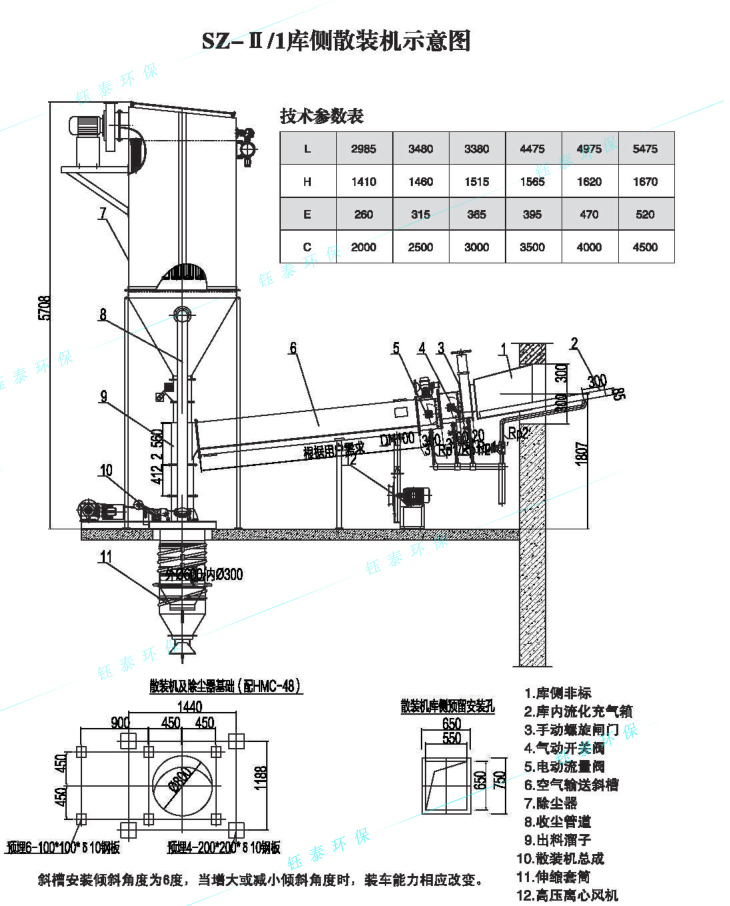 散裝機(jī)自帶除塵器,過濾面積為64m2,排塵濃度≤30mg/Nm³(滿足國(guó)家環(huán)保有關(guān)標(biāo)準(zhǔn)要求)。